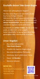 Ein Take-Down-Bogen besteht aus drei Teilen. Einem Griffstück und den beiden Wurfarmen. Der Vorteil eines Take-Down-Bogens liegt in seiner Zerlegbarkeit. Die Wurfarme sind mit nur zwei Schrauben befestigt. Bei Bedarf können sie schnell demontiert und wieder montiert werden. Die Wurfarme können „mitwachsen“. Das bedeutet, dass die Zugkraft an die Fortschritte des Schützen angepasst werden kann. Sollte ein Wurfarm einmal brechen, kann er problemlos ausgetauscht werden.Ein Take-Down-Bogen ist besonders für Anfänger im Bogensport geeignet.Ort: Bogenhalle in Unterheinriet. Nähe Heilbronn